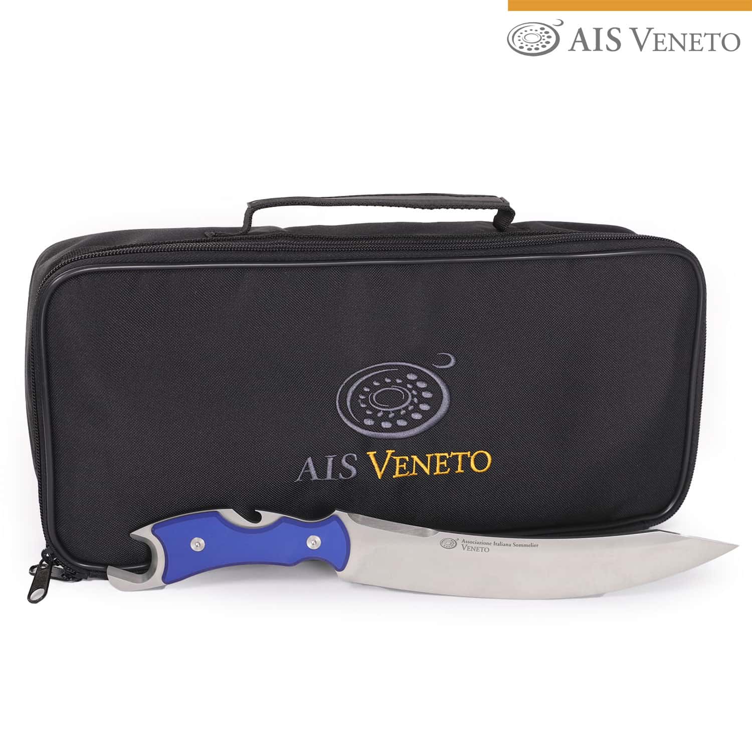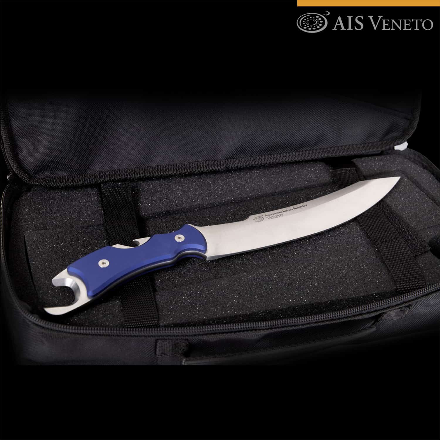 - Custodia porta sciabola personalizzata con ricamo esterno marchio AIS Veneto bicolore (giallo e grigio). Alloggio interno con fondo antiurto in polietilene espanso, doppio cinturino di fissaggio con chiusure in Velcro, per un trasporto sicuro.